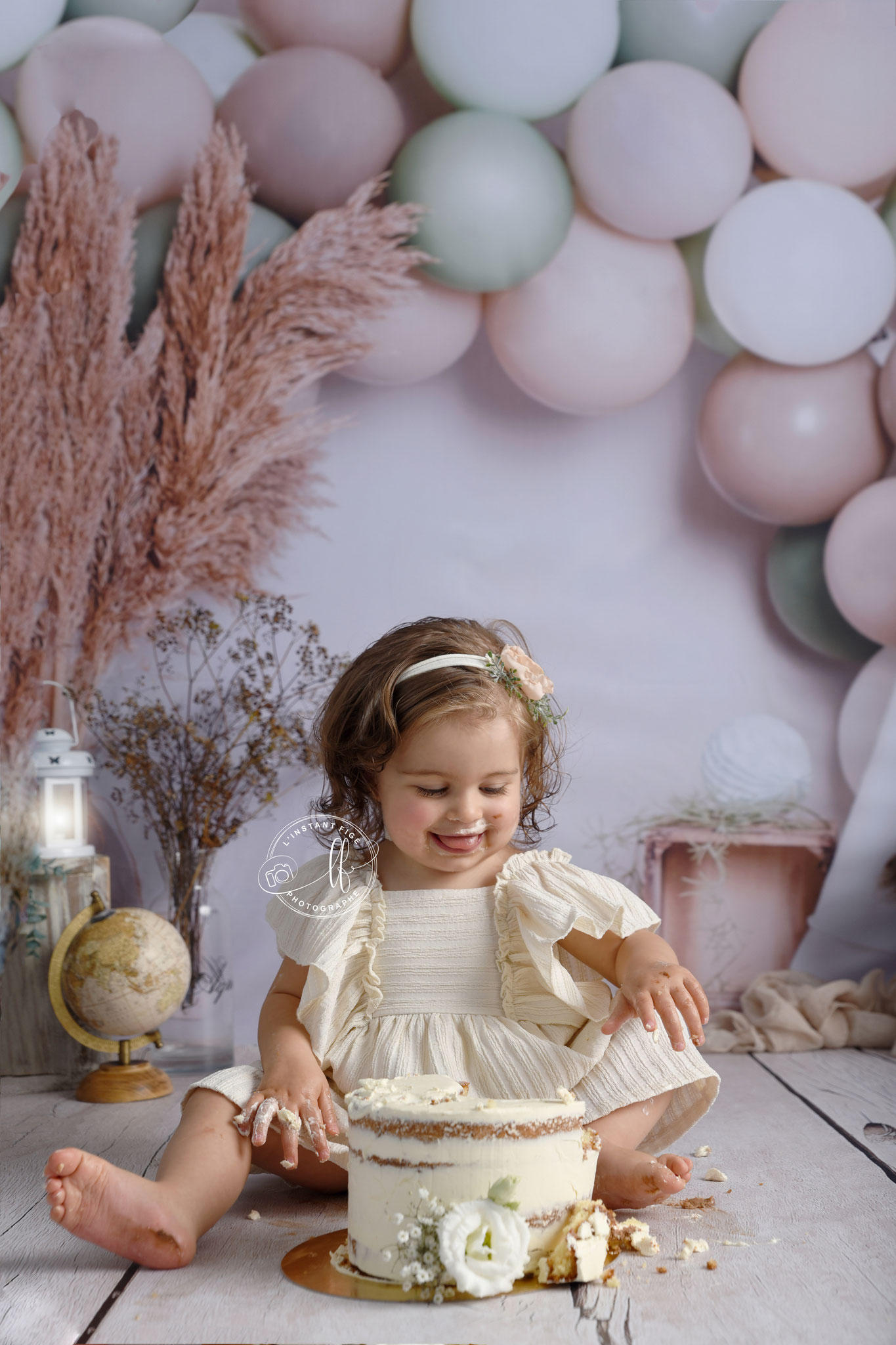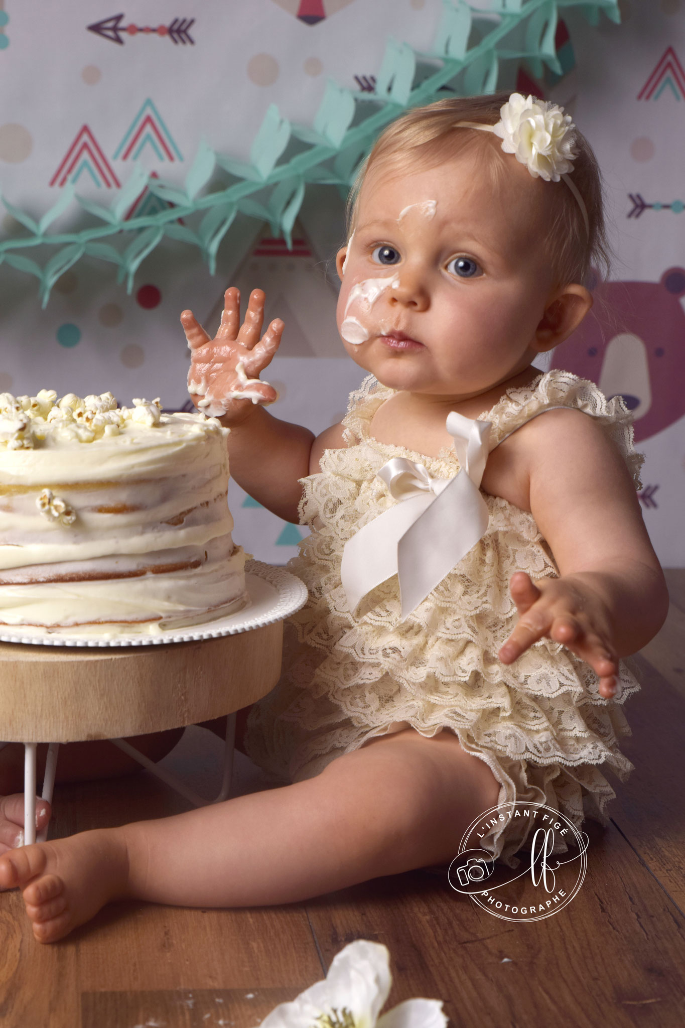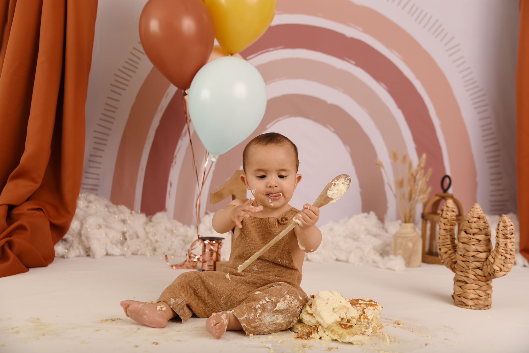 Une séance anniversaire avec un décor unique, avec un Smash cake (détruire le gâteau) réalisé en fonction du thème par ma partenaire Eviepatisserie.